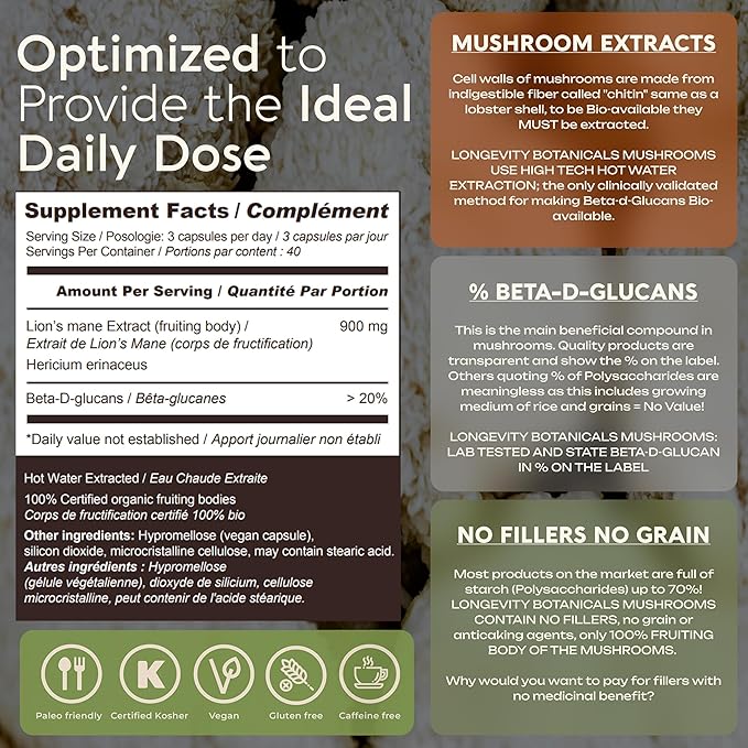- 🔬 HIGH BETA-D-GLUCANS: Verified by third-party labs, our Lion's Mane capsules highlight a potent >20% Beta-d-Glucans content. Our bio-enhanced hot water extraction process ensures the retention of the mushrooms' inherent qualities, delivering highly effective health-supporting compounds