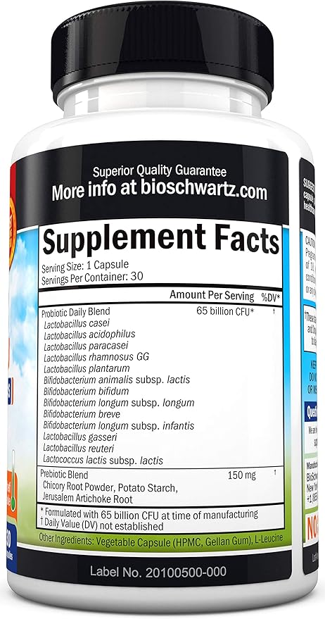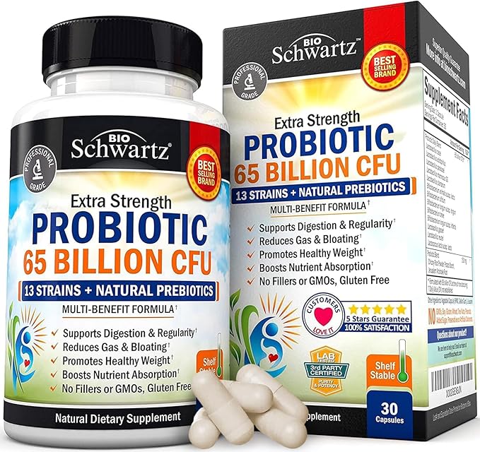 - 65 billion CFUs & 13 probiotic strains: BioSchwartz extra strength probiotic is formulated with 65 billion CFUs (colony-forming units), natural prebiotics, and 13 powerful probiotic strains in every serving to deliver comprehensive digestive support. By promoting a natural balance and high-nutrient absorption, this extra strength probiotics supplement can help combat occasional discomfort including gas, bloating and constipation