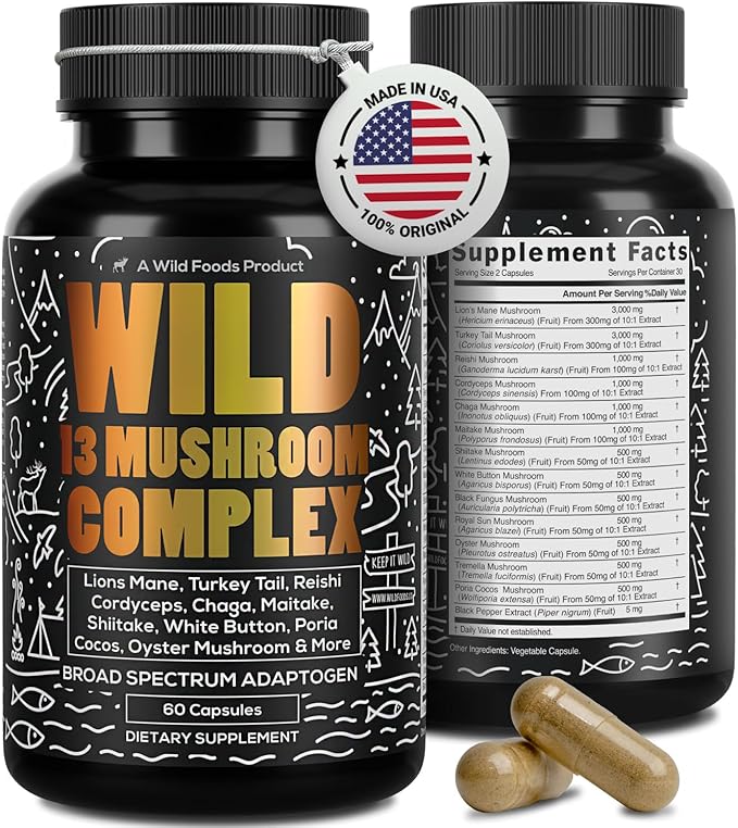 Wild Foods Premium Mushroom Supplement Complex | 10:1 Mushroom Extract 13 Organic Mushrooms: Lions Mane, Turkey Tail, Reishi & More Adaptogenic Mushrooms for Energy, Brain & Immune Health(60 Capsules)