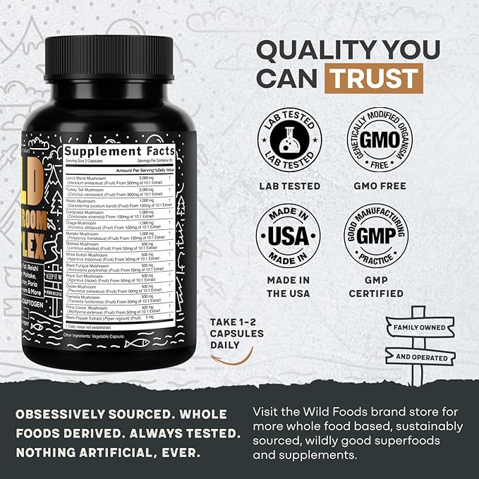 - Organic & Highly Potent Mushroom Blend: Wild Foods mushroom complex capsules are a potent blend of 13 USDA-certified organic mushrooms. Includes: Lions Mane, Turkey Tail, Reishi, Cordyceps, Chaga, Shiitake, Maitake, Tremella, Oyster mushrooms and more