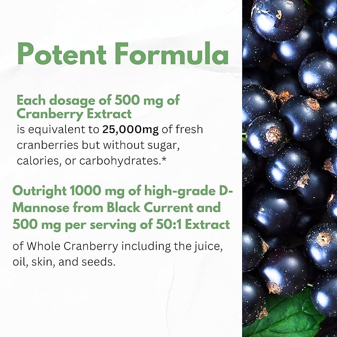 - HIGHEST POTENCY FOR RESULT ✔ HCL Dmannose found in black currant, and it is USP Grade. Our 50:1 High Concentrated Cranberry Extract is made from Whole-Fruits, containing the skin, seeds & oil. It is important to know that Cranberry Juice Concentrate does NOT contain all the nutrients like fiber protein potassium omega 3 6 9. Use of the whole cranberries promise head-to-toe nutritional benefits & an abundance of antioxidants proanthocyanidins (PAC).