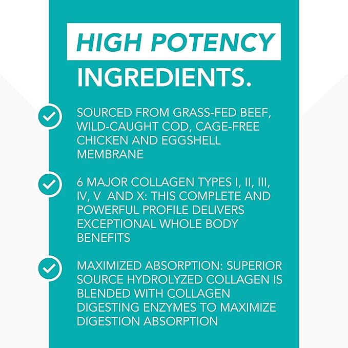 - Complete Collagen Profile; Contains six major collagen types, plus enzymes; Our hydrolyzed collagen peptides are broken down into smaller amino acids for easy digestion and absorption