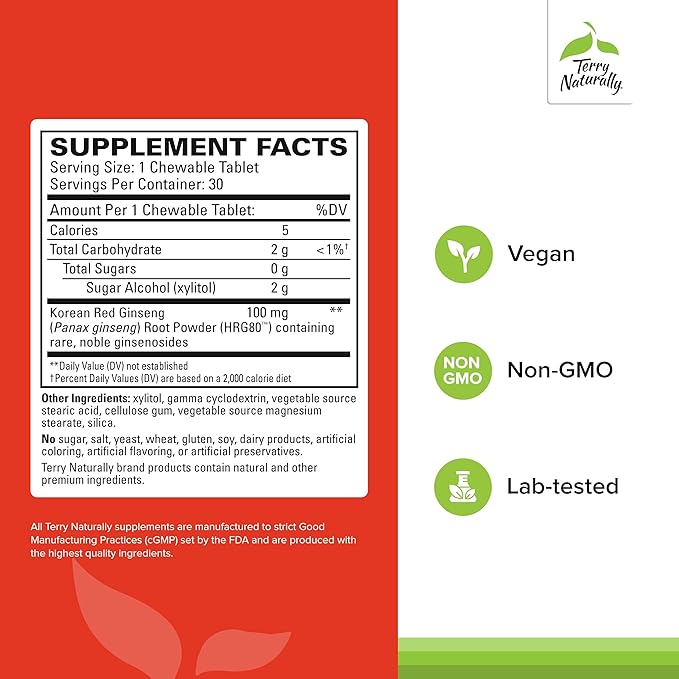 Terry Naturally HRG80 Red Ginseng Energy - Support Healthy Energy & Focus - Herbal Supplement with Korean Red Ginseng Root Powder - Vegan Tablets to Aid Healthy Endurance - 30 Chewable Tablets