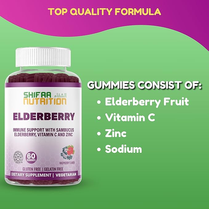 - IMMUNE SUPPORT: SHIFAA NUTRITION Elderberry Gummies For Kids and Adults are made of Black Elderberry (Sambucus Nigra L), Zinc, and Vitamin C and these nutrients play a vital role in supporting the Immune system. Due to immune-supportive premium ingredients, our Adults and Kids Elderberry Gummy provides seasonal support for runny nose, sneezing, sniffles, cough, and congestion.