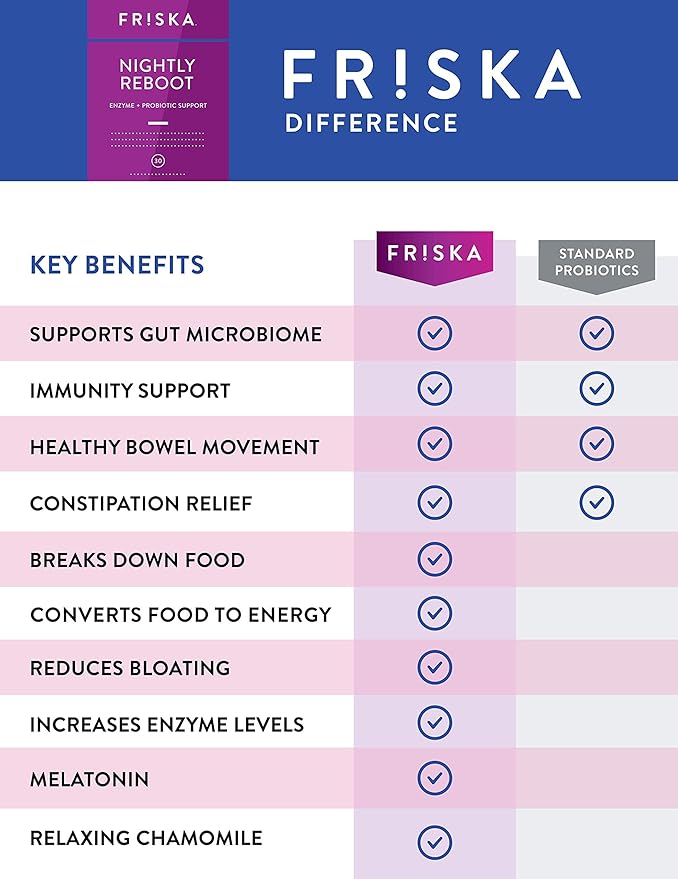 FRISKA Nightly Reboot Enzyme and Probiotics Supplement, Promotes Better Digestion and Sleep, Supports Gut Health for Men and Women, Melatonin, Chamomile, 30 Capsules