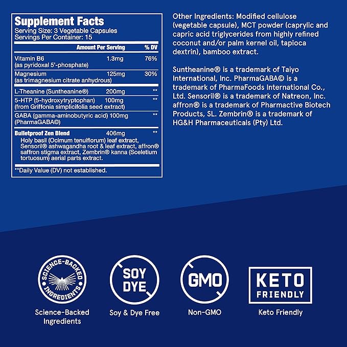 - Contains one 45-count bottle of Bulletproof Zen Mode stress relief and tranquility capsules
