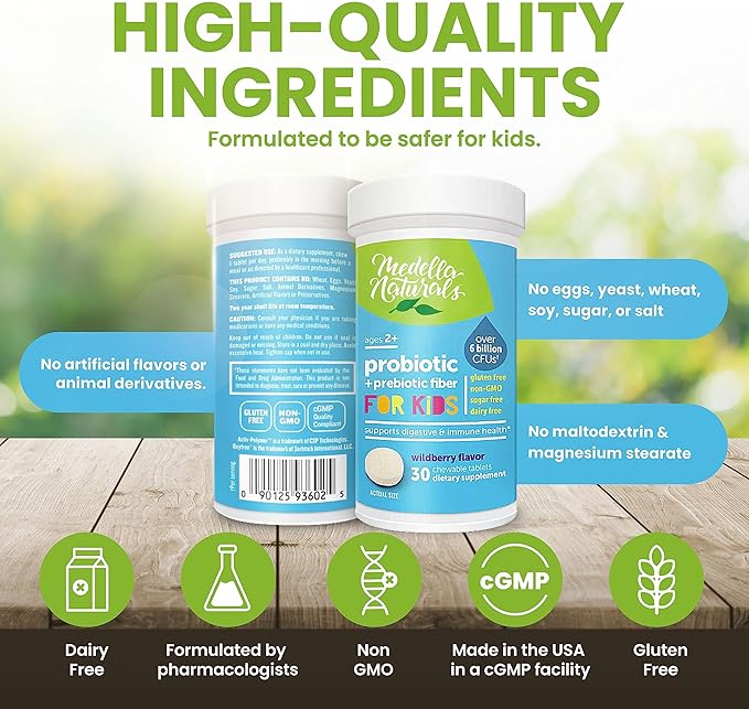 - HIGH-QUALITY SUPPLEMENT - These kids probiotic chewables are made with high-quality natural ingredients. It is non-GMO and has no dairy, gluten, wheat, soy, salt, sugar, maltodextrin, animal derivatives, eggs, or artificial flavors.