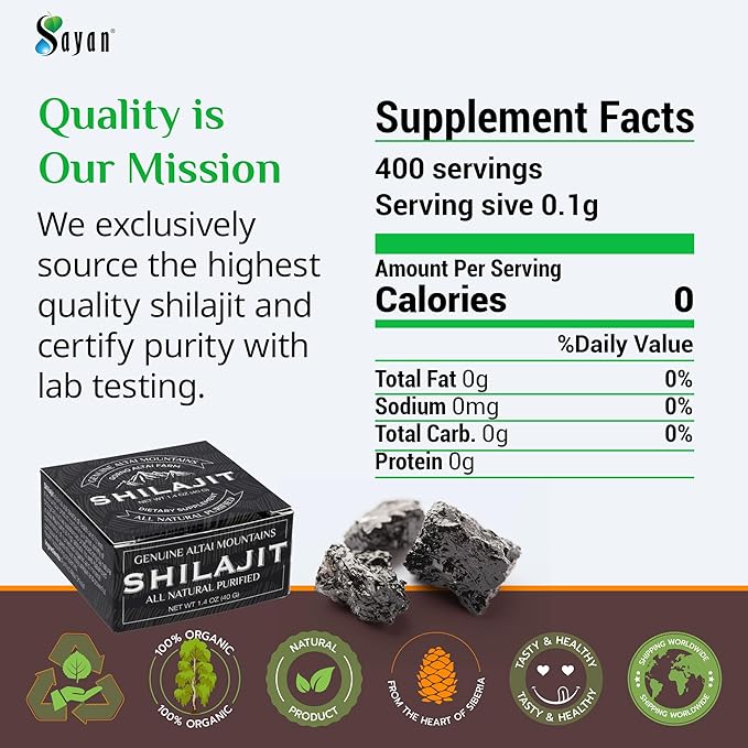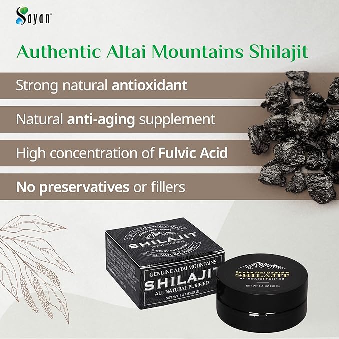 - Fresh, Pure Potent: Sayan's pristine, sustainably harvested Shilajit Resin contains no chemicals, additives, sugars, or artificial coloring—it's 100% natural and easy to use. It is caffeine-free, non-GMO, vegan, and paleo-friendly.