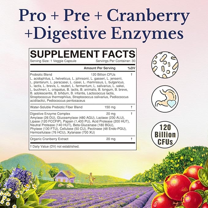 - Pro + Pre + Digestive Enzymes + Organic Cranberry: Our Once Daily Probiotics for Women is enhanced with organic cranberry extract and natural plant-based digestive enzymes as well as water-soluble prebiotics fiber to help support the gut, immune and vaginal health.* All the ingredients work synergistically to maximize their strength and maintain natural gastrointestinal & urinary tract balance.*