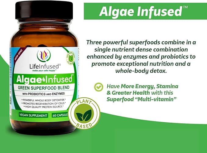 Life Infused Algae Infused - Premium Green Superfood Blend, Spirulina, Chlorella, Probiotics & Enzyme for More Energy, Digestion, Detox & Immune Support: 60 Caps