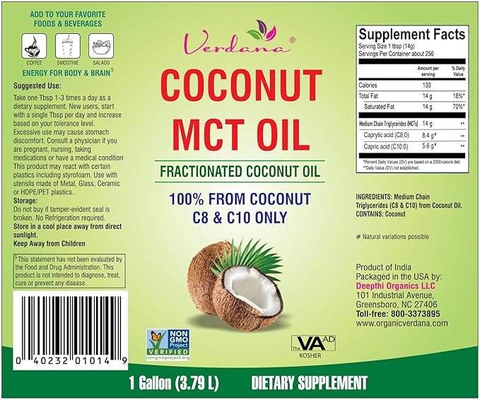 Verdana MCT Oil, Fractionated, 100% from Coconut - 1 Gallon - Kosher Food Grade, Vegan, Non-GMO - Great for Keto and Paleo Diet, Oil Pulling Oral Rinse Mouthwash (128 Fl Oz)