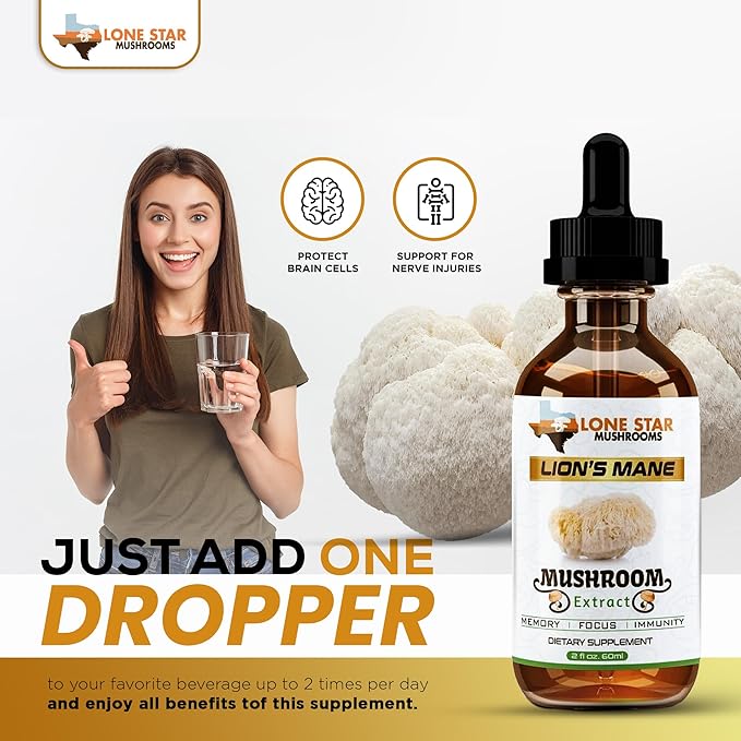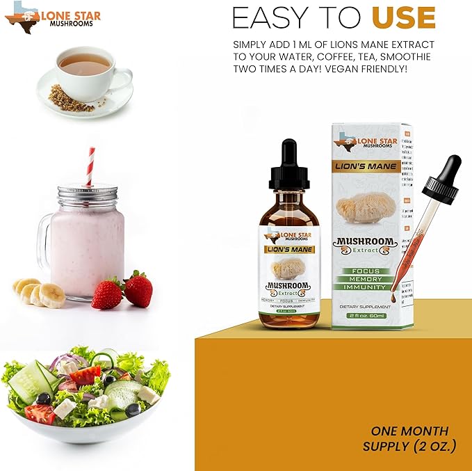 - 🌟 Convenient Usage - Enjoy a full month's supply without the hassle of swallowing large pills. Simply blend 1 mL of Lions Mane Extract into your daily water, coffee, tea, or smoothie, twice a day! Plus, it's vegan-friendly for everyone to enjoy.