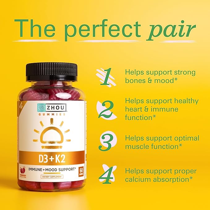 Zhou D3+K2 - Vitamin D3 K2 Supplement for Women & Men, Immune Support Vit D3 and K2 Gummy, Gelatin Free Formula with 5000 IU of D3 and MK-7 - 60 Veggie Gummies (Pack of 1)