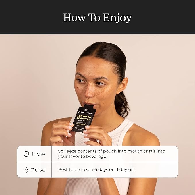 CYMBIOTIKA Activated Charcoal Liquid Supplement with Vitamin E, Gut Health & Digestive Support for Adults, Helps Cleanse, Detox, Support Gas, Bloating, Lemon Cream Flavor, Vegan, 10ml Pouches, 26 Pack