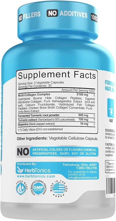 Multi Collagen Complex (Types 1 2 3 5 and 10) | Hydrolyzed Collagen Peptides | Collagen for Women & Men | Hair, Skin, Nails, Joint Support (with Turmeric) | 90 Capsules