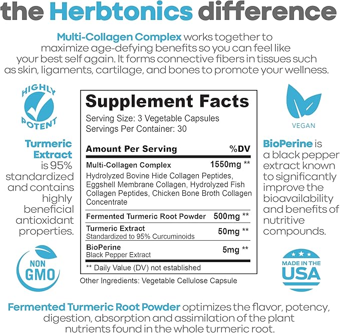 - Multi Collagen Protein Complex: Provides multiple types of grass fed collagen (Types 1, 2, 3, 5 and 10) allowing for the maximum benefit as a collagen focused dietary supplement as well as a powerful turmeric complex.