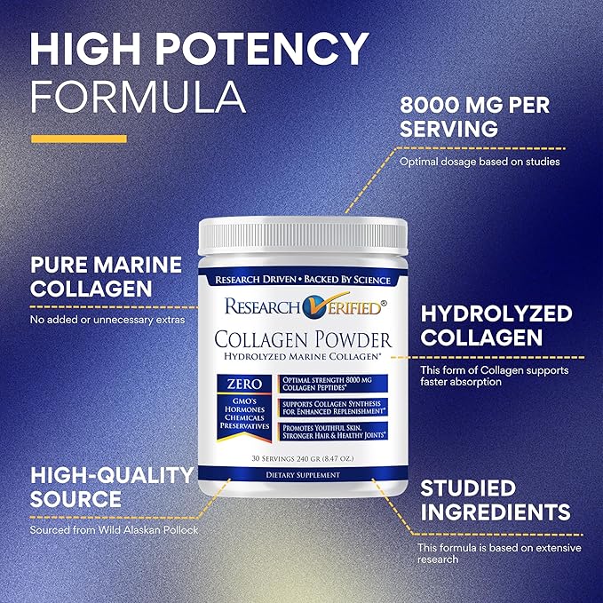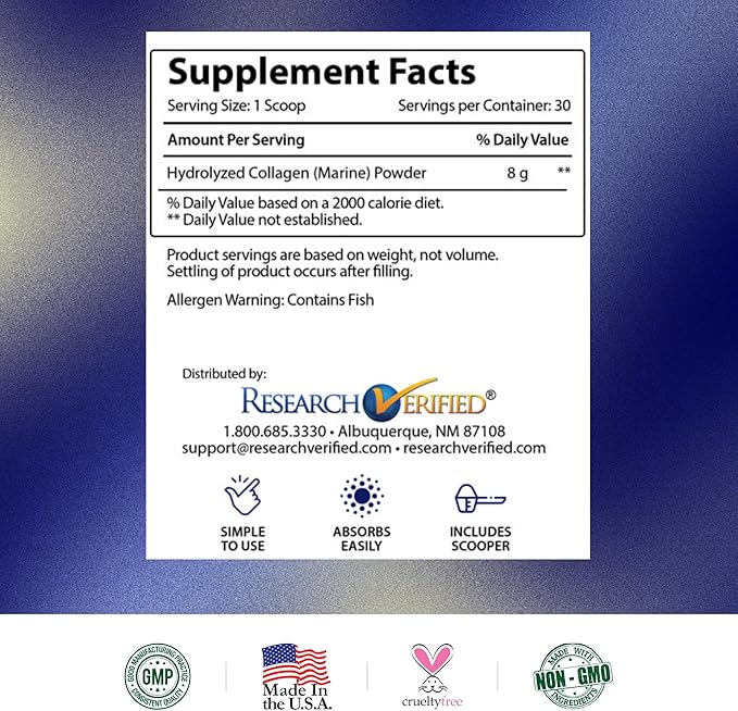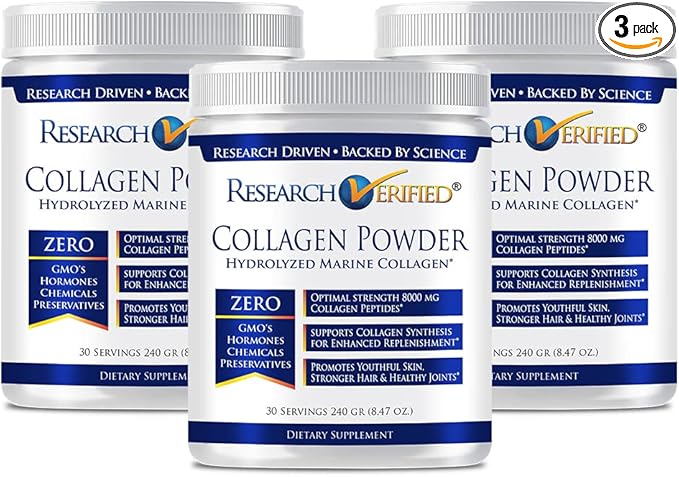 Research Verified® Collagen Powder - Hydrolyzed Marine Collagen - Unflavored - Skin Hydration and Elasticity, Muscle Recovery, Non GMO - 30 Scoops Per Container - 3 Month Supply
