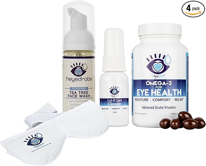 Triglyceride Omega 3 Fish Oil, Heated Eye Mask, Lid and Lash Cleanser Foaming Tea Tree Face Wash Bundle for Eye Health, Provides Relief for Irritated Eyes
