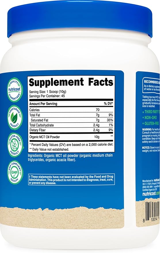 Nutricost Organic MCT Oil Powder 1 LB - Certified USDA Organic, Great for Keto, Ketosis and Ketogenic Diets - Zero Net Carbs (Medium Chain Triglyceride)