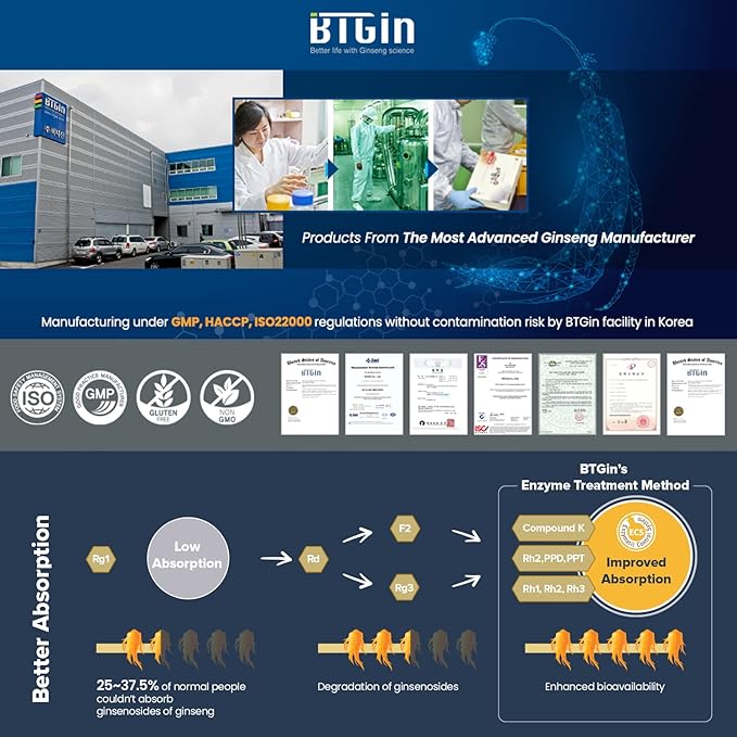- Efficacy: strong health benefits due to the active ingredient "Enhanced Ginsenosides” from enzyme processed Korean red ginseng roots by BTGin Bio Technology. This supports immune health, reducing inflammation, antioxidant, and others from Specific Ginsenosides Rg3, Compound K