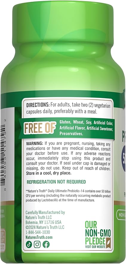 Nature's Truth Probiotic 50 Billion CFU | 200mg Prebiotics | 60 Capsules | Vegetarian, Non-GMO & Gluten Free Supplement for Men and Women | Supports Digestive Health