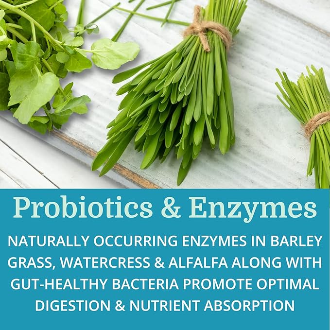 - Nutrient Absorption — Barley Grass & Alfalfa are superfoods rich in vitamins, minerals, amino acids, and digestive enzymes. Bile Salts & Pancreas Concentrate support the breakdown of proteins, fats and carbs.