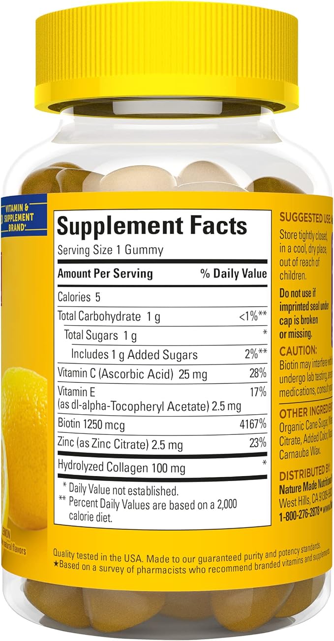 Nature Made Collagen Gummies with Vitamin C, Zinc and Biotin, Hydrolyzed Collagen Peptides Supplement for Healthy Skin Support, 60 Gummies, 60 Day Supply