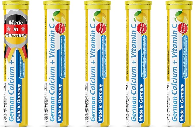 German Calcium + VIT. C - 100 Vegan Drink Effervescent Tablets - Lemon Lime Flavor - Made in Germany