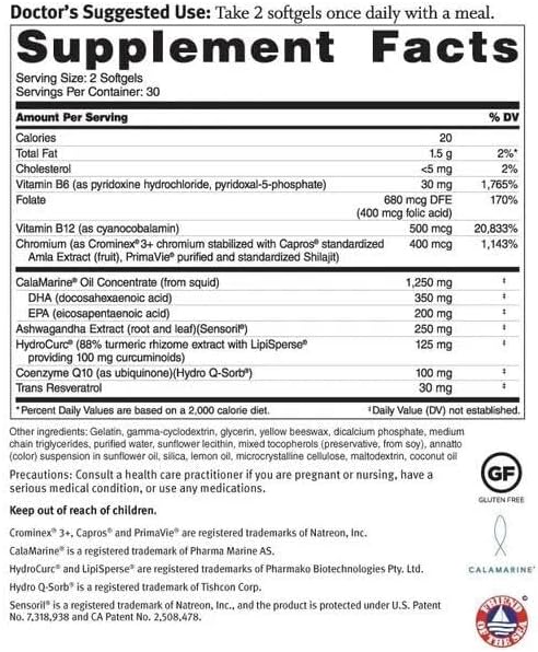 - SUPPORTS MULTIPLE HEART HEALTH BENEFITS IN 1 FORMULA. This formula brings in ALL the heavy hitters when it comes to heart health—heart healthy DHA from CalaMarine omega-3 oil, highly bioavailable HydroCurc turmeric, trans resveratrol, PLUS a full 100mg of absorbable Hydro Q-Sorb CoQ10—critical for anyone over 60or with lifestyle factors that deplete this nutrient. Plus, essential B vitamins and folic acid for heart and brain health, cellular energy production, and more.