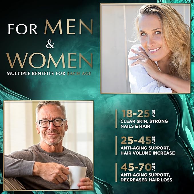 - ESSENTIAL BIOTIN AND COLLAGEN SUPPLEMENTS. Collagen production declines as we age, leading to drier skin and hair loss. Collagen supplements for women and men help you stay ahead of nature.