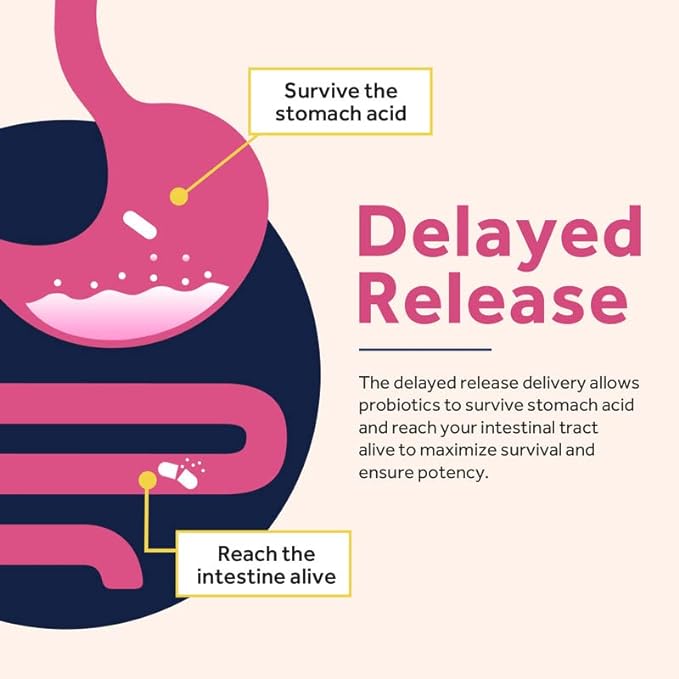 - Shelf Stable & Delayed Release: Our shelf stable probiotics doesn’t need refrigeration, meaning that you can throw it in your briefcase, handbag or suitcase and enjoy it anytime and anywhere you like. The delayed release technology allows further our acid and bile resistant probiotics to make their way through the stomach alive to be of benefit