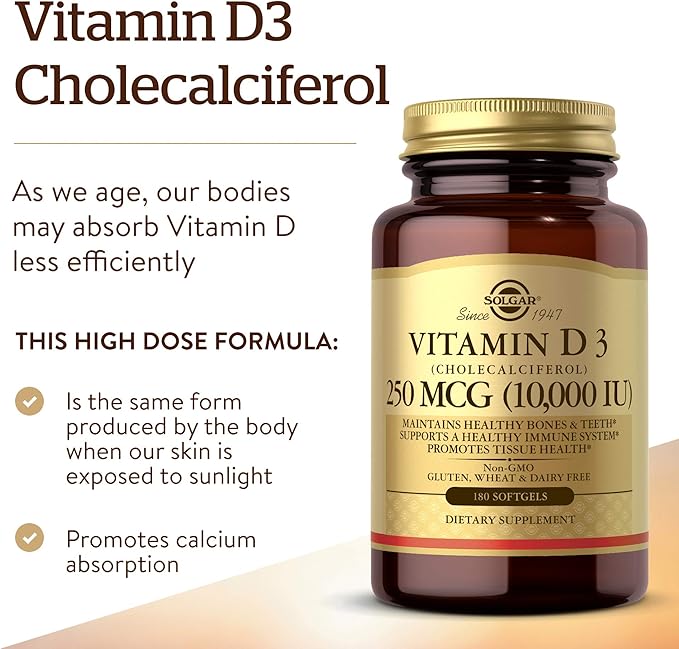 - Support your immune system; Solgar Vitamin D3 (Cholecalciferol) 250mcg (10000 IU) soft gels support a healthy immune system and neuromuscular function