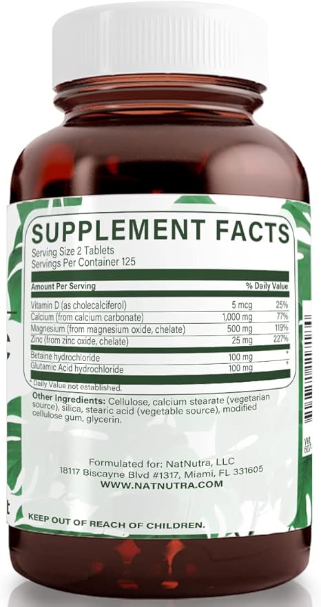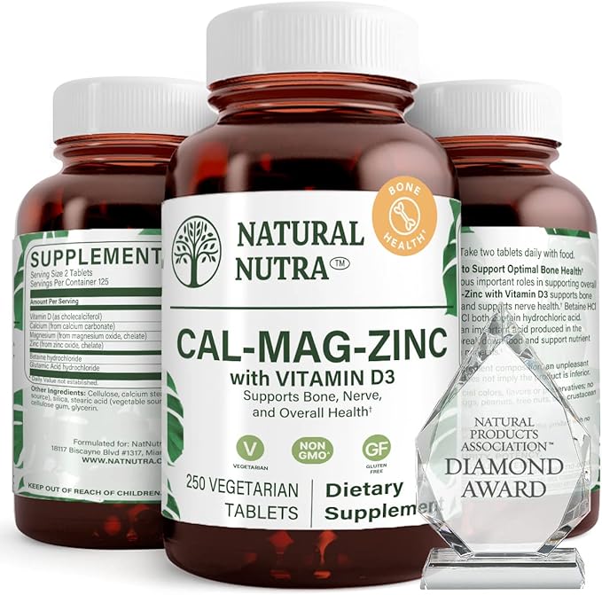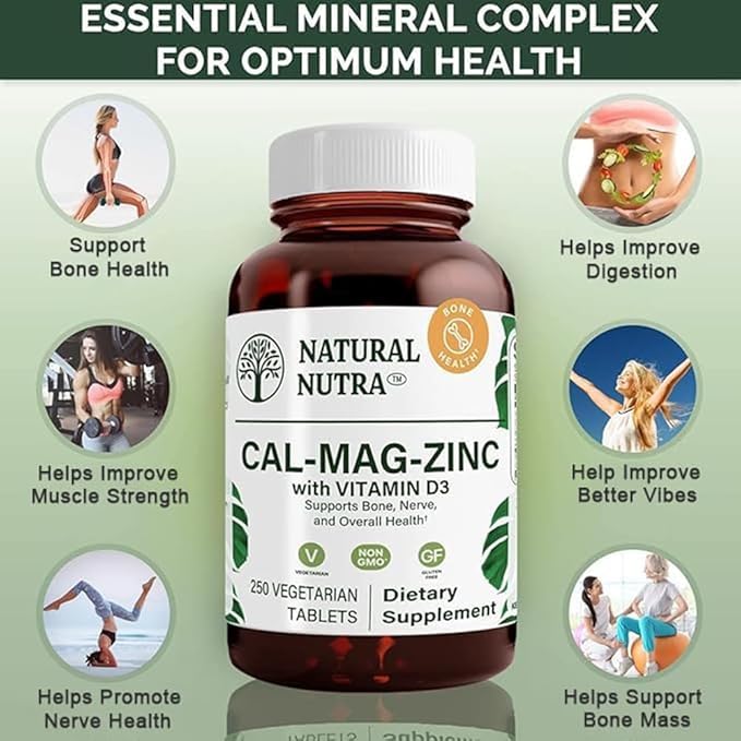 Natural Nutra Calcium Magnesium Zinc Supplement with Vitamin D3 for Bone Strength, Helps Improve Digestion, Gluten Free and Sugar-Free, Essential Mineral Complex, 1000/500/25 mg (250 Count)