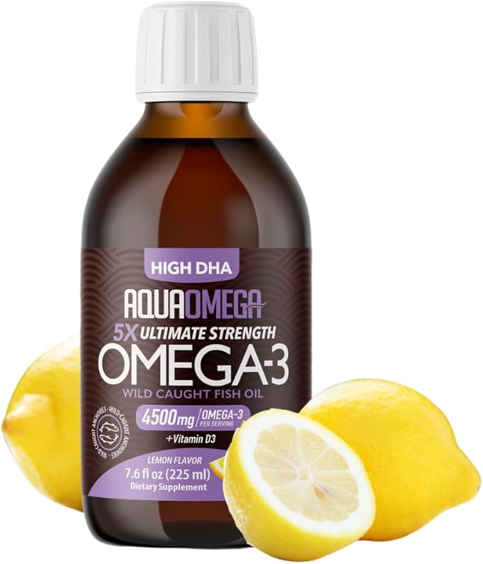 5X Ultimate Strength Omega 3 Fish Oil Liquid 4500mg, Omega 3 Liquid Fish Oil Burpless, High DHA EPA Omega3 Supplement for Women and Men with Vitamin D, 3380mg DHA, 670mg EPA, 7.60 floz, Lemon Flavor