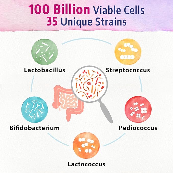 - A Large CFU Count and Diverse Strains: Our 4-in-1 Probiotics for Women carries an impressive 100 billion CFU from 35 active strains to increase the microbial richness and diversity in your body.* Each bottle offers a guaranteed shelf life without refrigeration and utilizes delayed-release capsules to ensure these microbes’ survival and delivery to the desired location.