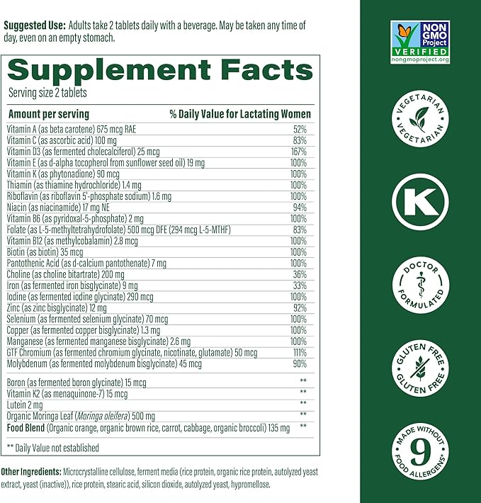 MegaFood Baby & Me 2 Postnatal Vitamins for Women Breastfeeding with Folate (Folic Acid Natural Form), Choline, Iodine, Vitamin D, Moringa Leaf and More - 60 Tabs (30 Servings)