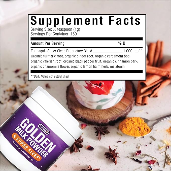 Turmaquik Organic Golden Moon Milk Turmeric Powder Mix, Super Sleep + Superfood Blend of Melatonin, Valerian, Chamomile, Lemon Balm, Ginger, Black Pepper, Curcumin, Cinnamon, Cardamom