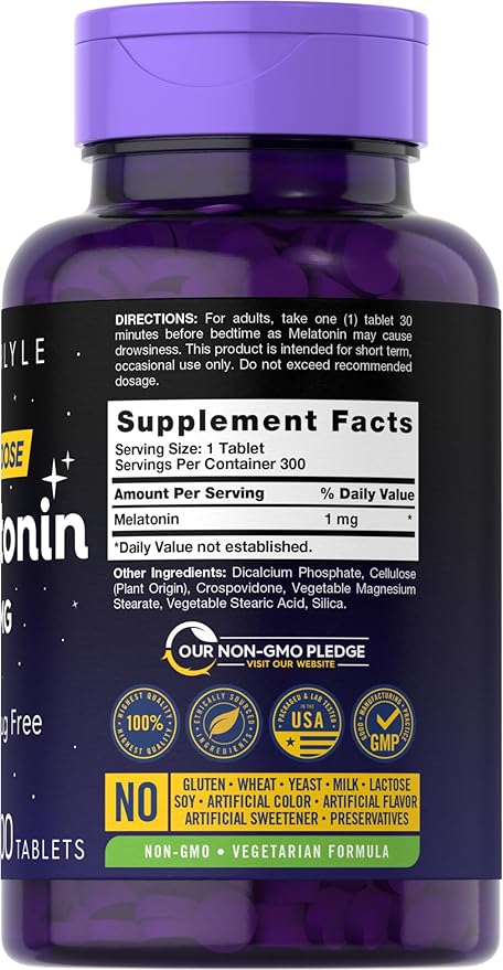 Carlyle Melatonin 1 mg | 300 Low Dose Tablets | Drug Free Aid | Vegetarian, Non-GMO, Gluten Free