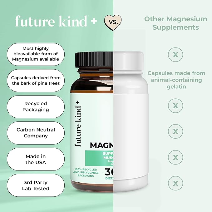 - Flavor : Future Kind Vegan Chelated Magnesium Supplement - (30 ct) Most Bioavailable & 6x More Potent Magnesium Capsules - Plant-Derived Magnesium for Sleep, Magnesium Pills for Rest, Energy & Muscle Functions Future Kind Vegan Chelated Magnesium Supplement - (30 ct) Most Bioavailable & 6x More Potent Magnesium Capsules - Plant-Derived Ma… See more