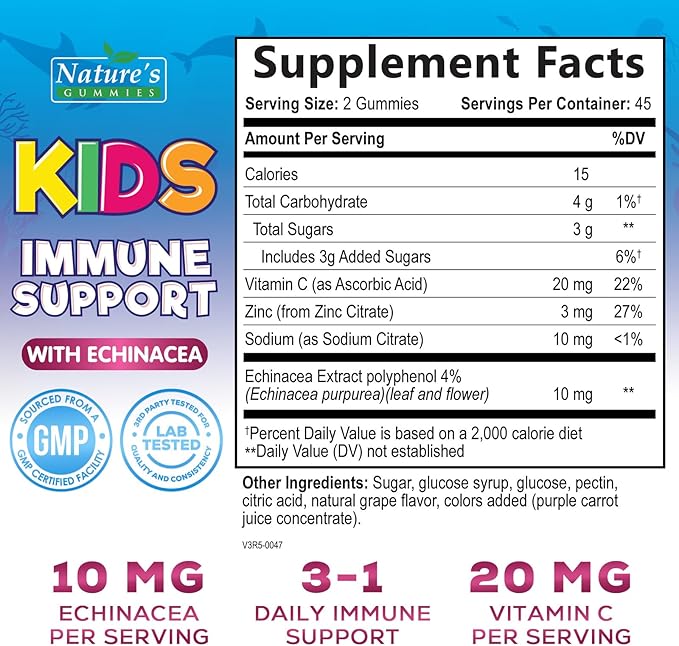 - KIDS IMMUNE SUPPORT VITAMINS: Nature's Gummies best children's echinacea plus zinc kids immunity gummy support with vit c dietary supplements chewable berry flavor gluten free non gmo child cough count kid daily booster childrens vitamin elderberry supplement equinacea cherry iron multi children multivitamin methylated multivitamins natural omega 3 system baby toddlers usda vegan defense boost edelberry sambucus syrup vitamina vitaminas para niños 42 50 60 builder natures nutrition teens toddler ages 4 year old probiotic probiotics gomitas gummie liquid elberry