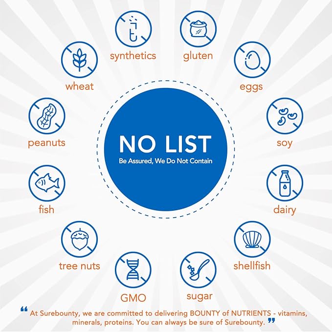 - No Allergens or Nasties: Surebounty has always been dedicated to formulating supplements that cater to people from all walks of life and can easily fit into their daily routines. We want you to enjoy the amazing benefits brought by our products without worrying about getting allergic. Be Assured: NO GMOs, soy, gluten, milk, sugar, egg, wheat, corn, nut, fish, shellfish. And never will you find Nasties like artificial ingredients, fillers, binders, or preservatives in Surebounty!