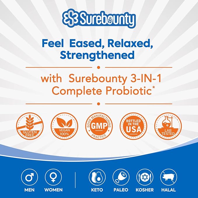 - Highest Potency for Men & Women: Surebounty’s 1 veggie capsule packs 3 powerful ingredients - 120 billion probiotics from 35 tested strains, raw prebiotics, and natural enzymes - all specially designed to help relieve discomforts associated with imbalanced flora, such as gas, bloating & irregular movements.* Take ONE capsule daily, Feel Eased, Relaxed & Strengthened with Surebounty 3-IN-1 Complete Probiotic.