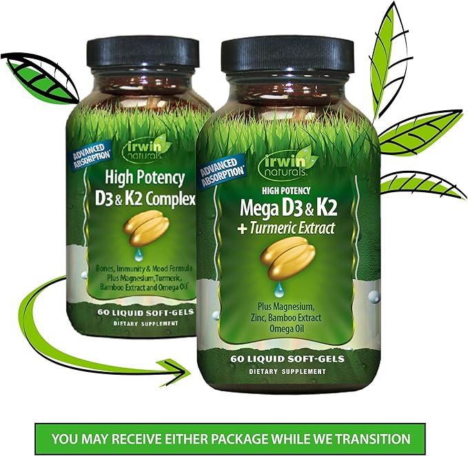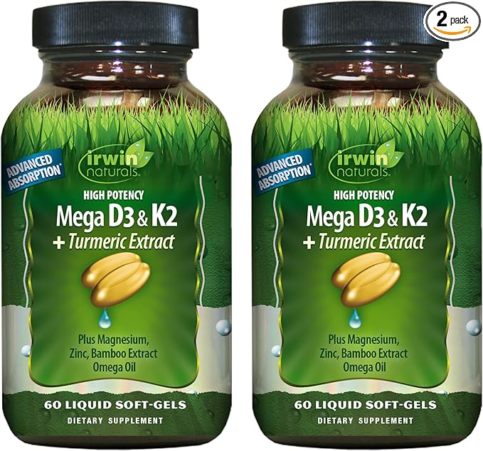Irwin Naturals High Potency Mega D3 & K2 + Turmeric Extract for Healthy Bones, Immune Function & Positive Mood - Advanced Absorption with Magnesium, Turmeric, Bamboo & Omega Oil - 60 Liquid Softgels