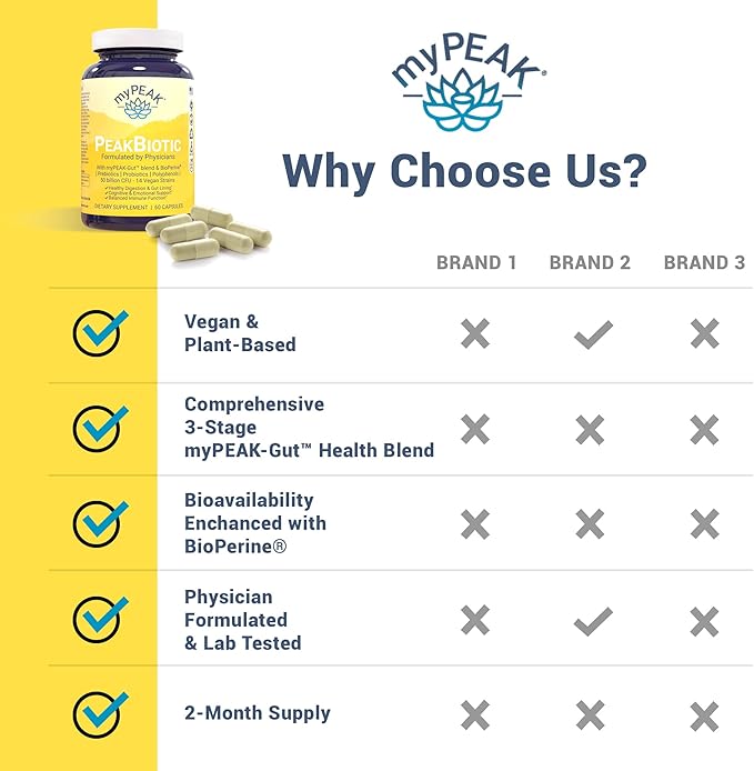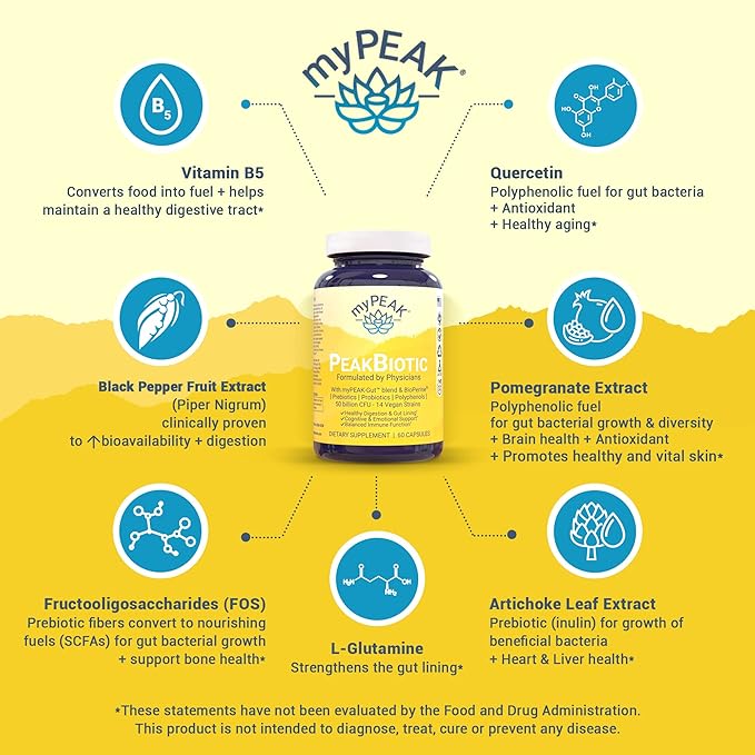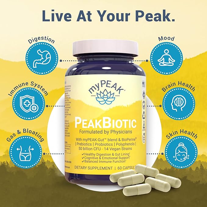 - Healthy Gut Means Healthy Body: Convenient, Comprehensive and Physician Formulated - PeakBiotic was made with your gut in mind. PeakBiotic combines comprehensive gut health supplements and mood probiotics, including pre and probiotics in just 1 pill a day. Hence, you can do more than survive each day. You can thrive, be great and live at your peak