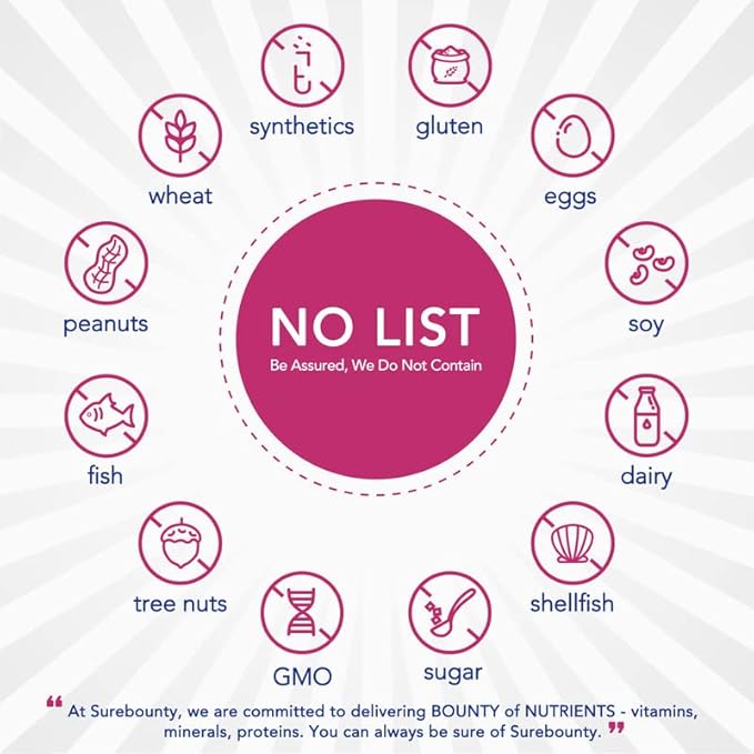 - No Allergens or Nasties: Surebounty has always been dedicated to formulating supplements that cater to people from all walks of life and can easily fit into their daily routines. We want you to enjoy the amazing benefits brought by our products without worrying about getting allergic. Be Assured: NO GMOs, soy, gluten, milk, sugar, egg, wheat, corn, nut, fish, shellfish. And never will you find Nasties like artificial ingredients, fillers, binders, or preservatives in Surebounty!