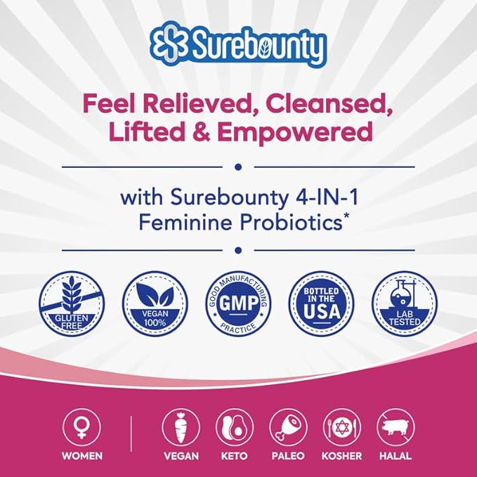 - Highest Potency for Women: Surebounty’s 1 veggie capsule comes in 4 powerful ingredients - 120 billion probiotics, raw prebiotics, natural enzymes, and organic cranberry extract - all specially designed to tailor to women’s specific needs with HIGHEST POTENCY available in the market.* This non-constipation formula supports digestive health, vaginal health & urinary health.* Take ONE capsule daily, Feel Relieved, Cleansed, Lifted & Strengthened with Surebounty 4-IN-1 Feminine Probiotic.