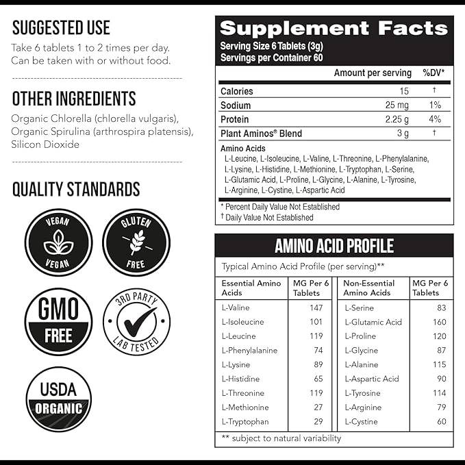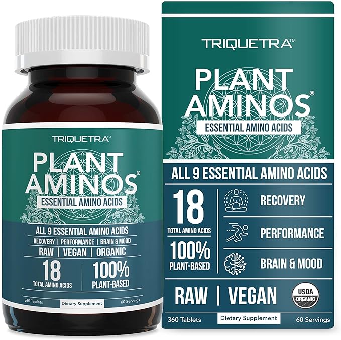 Plant Aminos Organic Essential Amino Acids (EAAs) & BCAA - 100% Plant-Based Raw, Vegan - All 9 Amino Acids with 18 Total Amino Acids (360 Tablets)