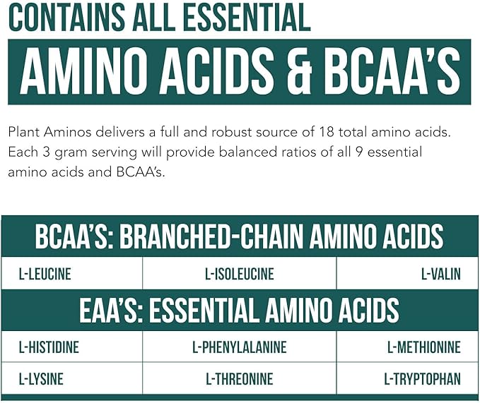 - Contains All 9 Essential Amino Acids, BCAA & 18 Total Amino Acids: Plant Aminos contains all 9 essential amino acids plus the 3 Branched-Chain Amino Acids (L-leucine, L-isoleucine & L-Valine) and 9 additional non-essential amino acids (L-Serine, L-Glutamic Acid, L-Proline, L-Glycine, L-Alanine, L-Aspartic Acid, L-Tyrosine, L-Arginine & L-Cystine).