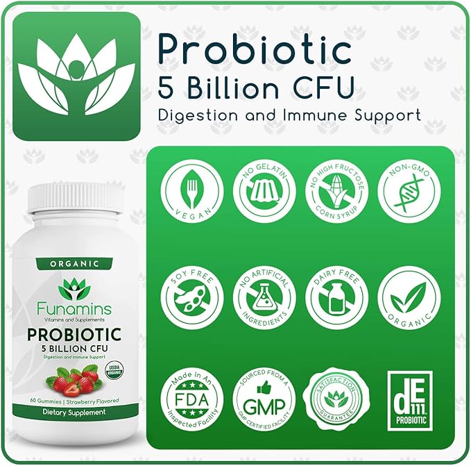 Organic Probiotic Gummies, 5 Billion CFU per Serving, 60 Count, Vegan, Supports Digestive Health and Immune Defense, for Women and Children; Strawberry Flavor
