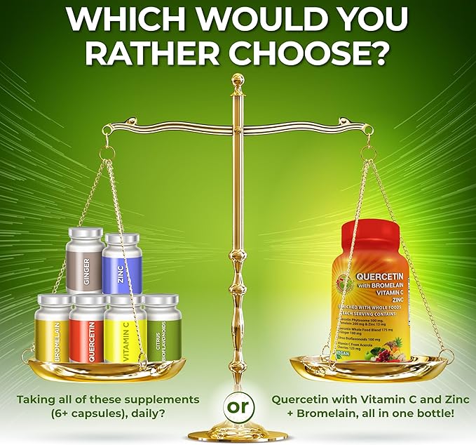 - Exceptional Value Formula: 500mg quercetin phytosome, 175mg organic quercetin blend from fruits and veggies, 15mg zinc picolinate, 200mg bromelain from pineapple, 100mg organic ginger root, 125mg vitamin C from acerola cherries, and 100mg citrus bioflavonoids.